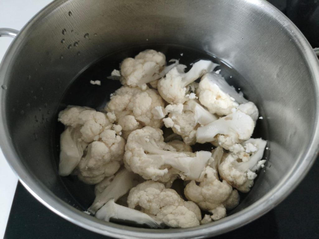 Koche den Blumenkohl in Salzwasser, bis er weich ist, lass ihn gut abtropfen und abkühlen.