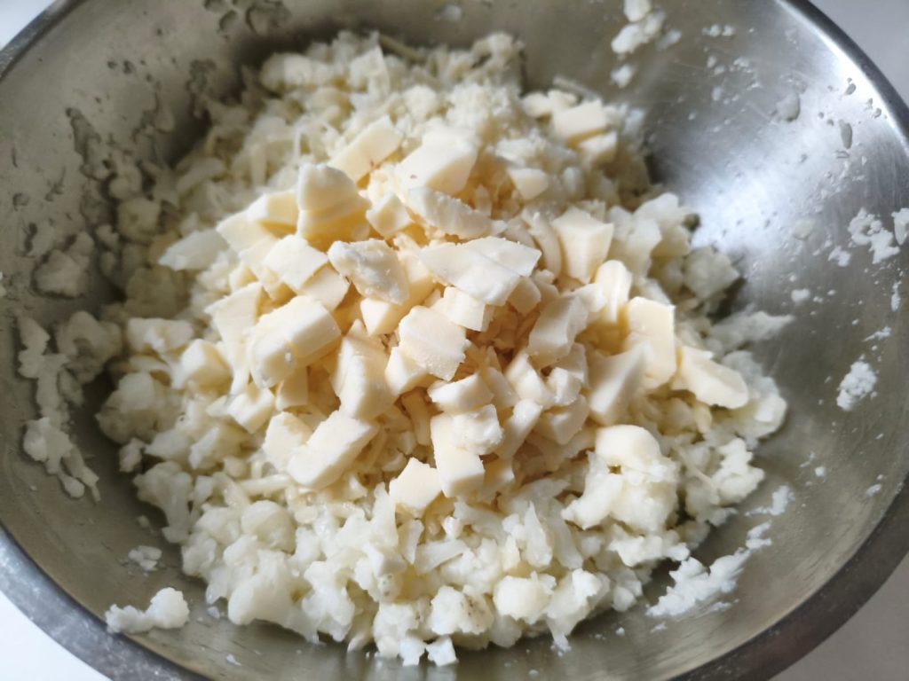 Stampfe den Blumenkohl mit einer Gabel zu einem groben Püree.