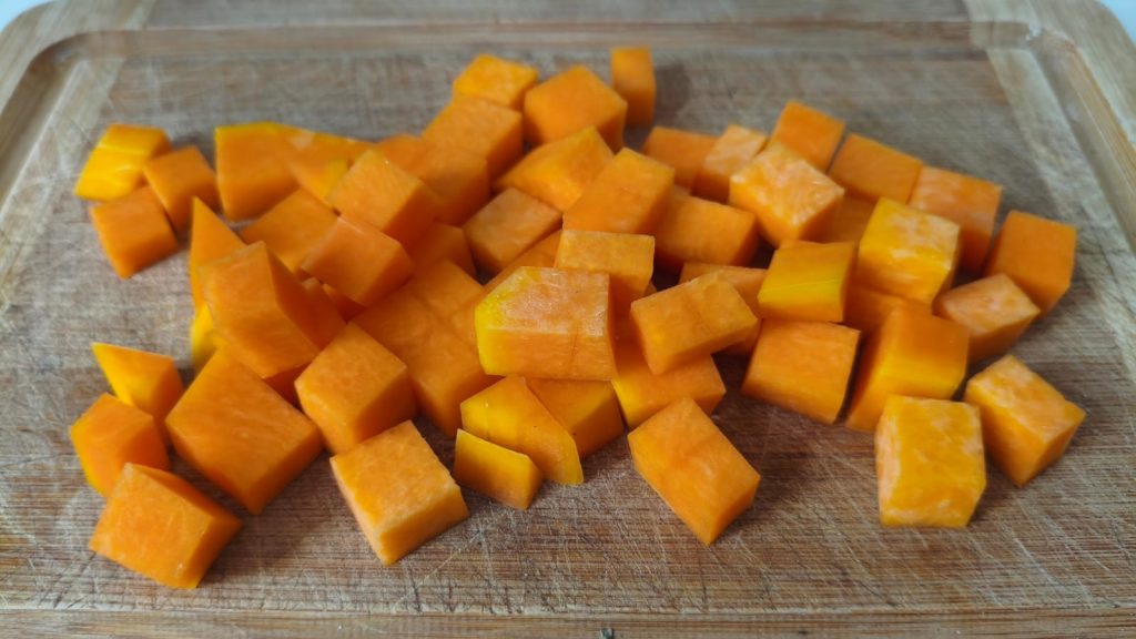 Den Kürbis säubern, die Schale und die inneren Fasern entfernen und in gleichmäßige Würfel schneiden.