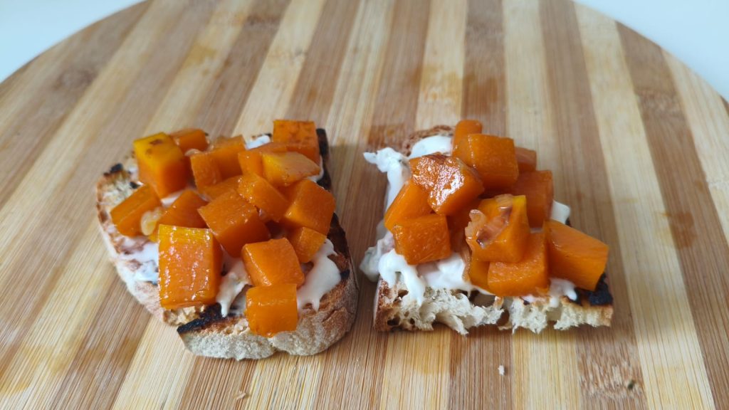 Die Basis ist das klassische Hausbrot, am besten leicht geröstet im Ofen oder in einer gusseisernen Pfanne, um knusprig zu werden und bereit, eine unwiderstehliche Mischung von Geschmäckern aufzunehmen. Der gewürfelte Kürbis, gekocht mit etwas Öl und Zwiebel, wird süß und weich, während der cremige Gorgonzola die kräftige und umhüllende Note hinzufügt, die perfekt mit der Süße des Kürbisses harmoniert. Und dann gibt es noch die gehackten Walnüsse, die Knusprigkeit und einen rustikalen Touch verleihen, der dieses Brot wirklich besonders macht.