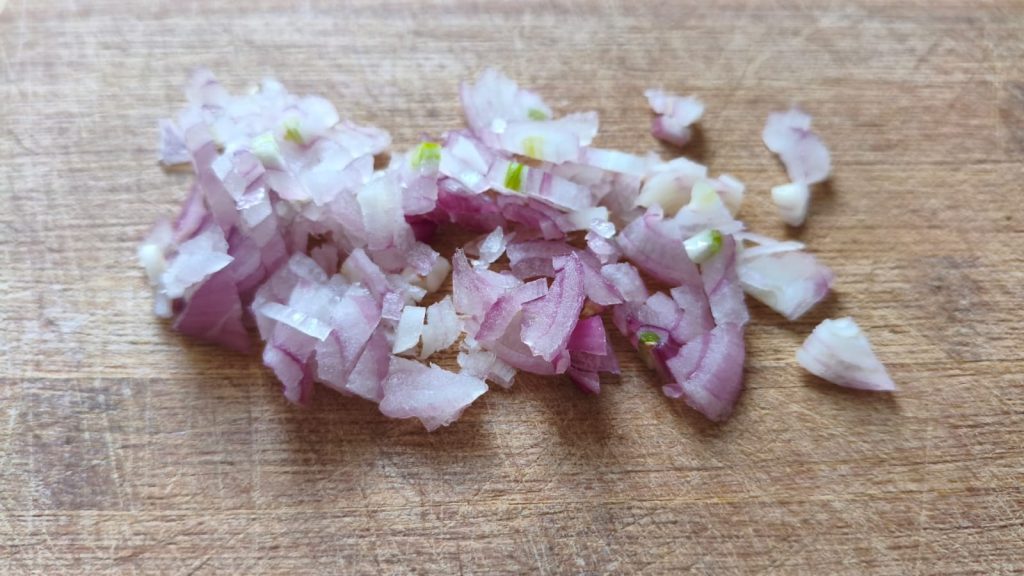 Die cremige Bohnensuppe zuzubereiten ist sehr einfach: Schalotte und Rosmarin hacken und in einer Pfanne mit einem Schuss Öl zusammengeben.