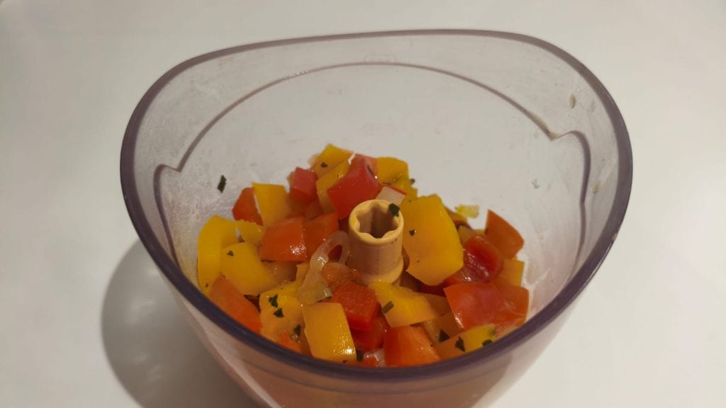 • Die Hälfte der Paprika pürieren, um eine homogene Creme zu erhalten