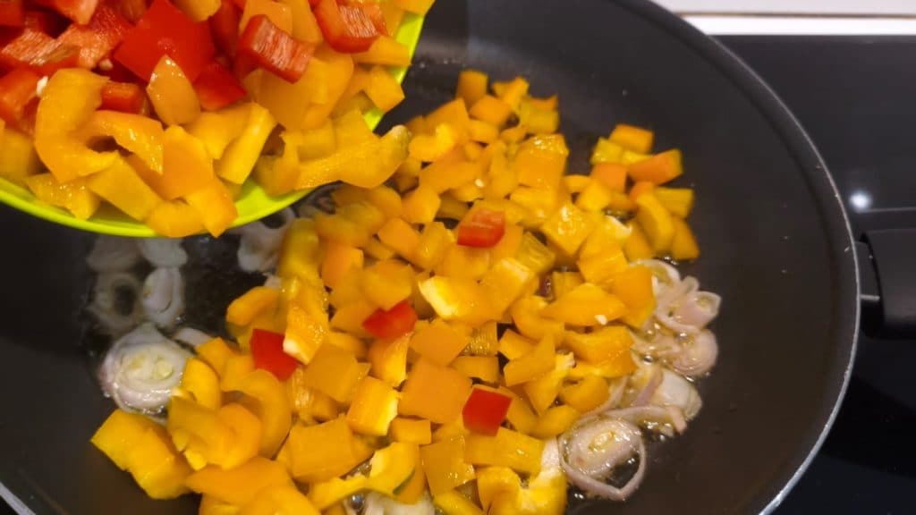• Wenn die Schalotte gebraten ist, die Paprika dazugeben und zwei Minuten auf hoher Flamme anbraten.