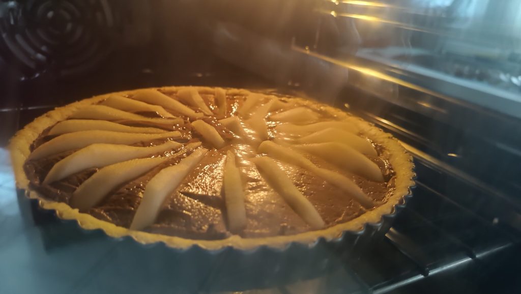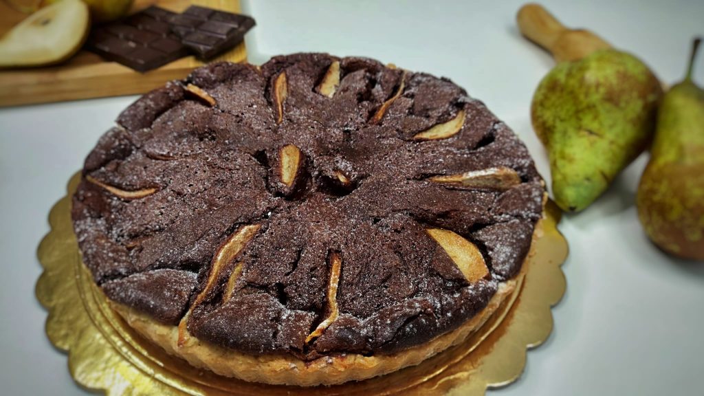 Mit einem knusprigen Mürbeteigboden und einer cremigen, umhüllenden Füllung ist der Birnen-Schokoladen-Kuchen das Symbol dafür, wie wenige hochwertige Zutaten ein kulinarisches Meisterwerk schaffen können. Die weichen und saftigen Birnen verleihen Frische und Leichtigkeit und gleichen den reichhaltigen und dekadenten Geschmack der Schokolade aus. Darüber hinaus macht seine elegante Präsentation ihn ideal für besondere Anlässe und garantiert Ihnen immer einen makellosen Eindruck bei Ihren Gästen.