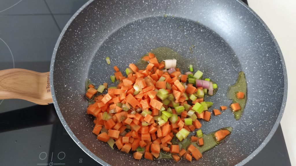 Beginnt damit, das gesamte Gemüse zu waschen und zu putzen. Schneidet Karotten, Paprika, Sellerie und Zucchini in kleine Würfel, damit sie gleichmäßig garen. In einer antihaftbeschichteten Pfanne die fein geschnittene Schalotte mit etwas Öl anschwitzen, dann das Gemüse hinzufügen.