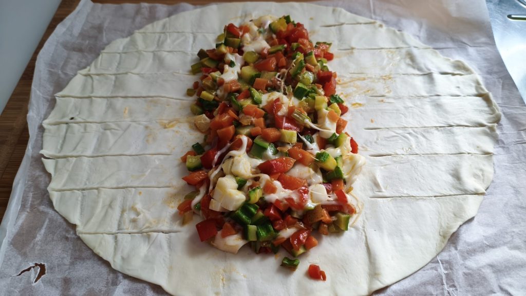 Für dieses vegetarische Rezept habe ich eine bunte Mischung aus Zucchini, Karotten, Paprika und Sellerie gewählt, die zusammen mit einer Schalotte in der Pfanne angebraten wurden, um viel Geschmack zu entwickeln. Der magische Touch? Würfel aus Galbanino, die im Ofen schmelzen und einen unwiderstehlichen Kontrast erzeugen! Das Besondere an diesem rustikalen Blätterteig ist die geflochtene Verschlussart: einfach seitliche Streifen einschneiden und abwechselnd über die Füllung legen – ein optischer Effekt, der alle begeistern wird. Mit verquirltem Ei bestreichen, mit einer Prise Sesamsamen bestreuen und ab in den Ofen bei 180°C.