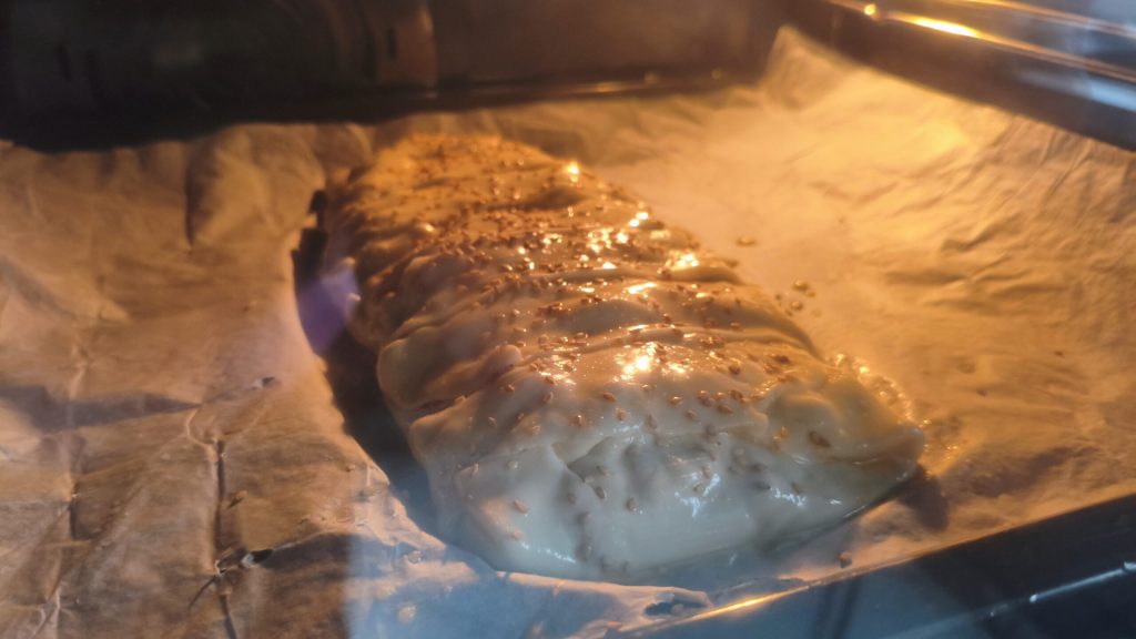 Im vorgeheizten Ofen bei 180°C (Ober/Unterhitze) ca. 30 Minuten backen, oder bis der Blätterteig schön goldbraun und aufgegangen ist.