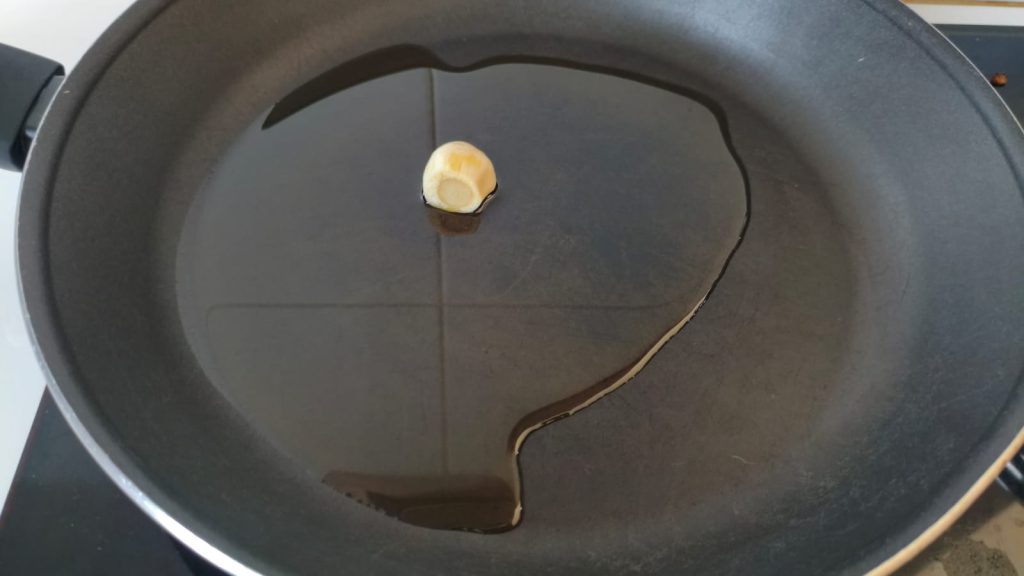 In einer Pfanne den Knoblauch mit einem Schuss Öl anbraten, das Hackfleisch und Salz hinzufügen; abkühlen lassen.