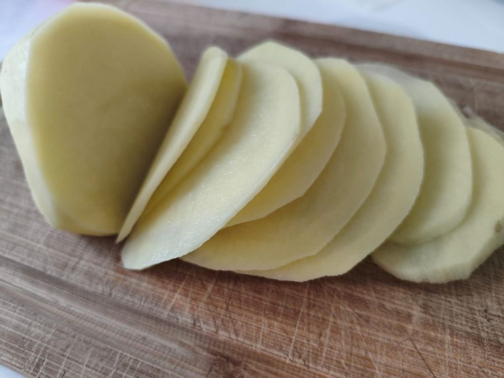 Schneide die Kartoffel in dünne Scheiben und stecke eine Kartoffelscheibe zwischen jede Falte des Filoteigs.