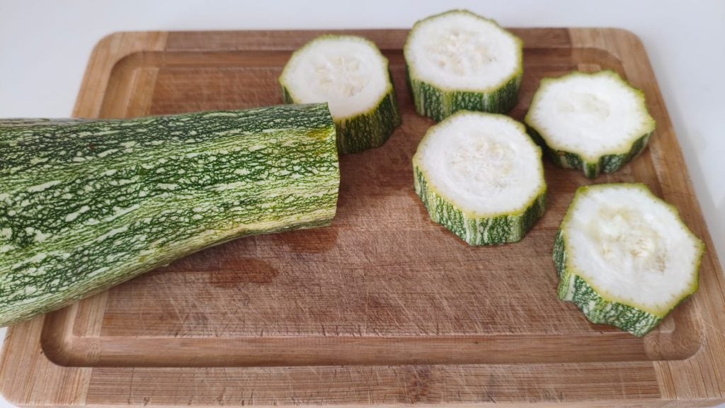 • Um die gefüllten Zucchini im Ofen mit Fleisch und Wurst zuzubereiten, beginnen Sie damit, die Zucchini zu waschen und die Enden abzuschneiden. Schneiden Sie sie in Scheiben.