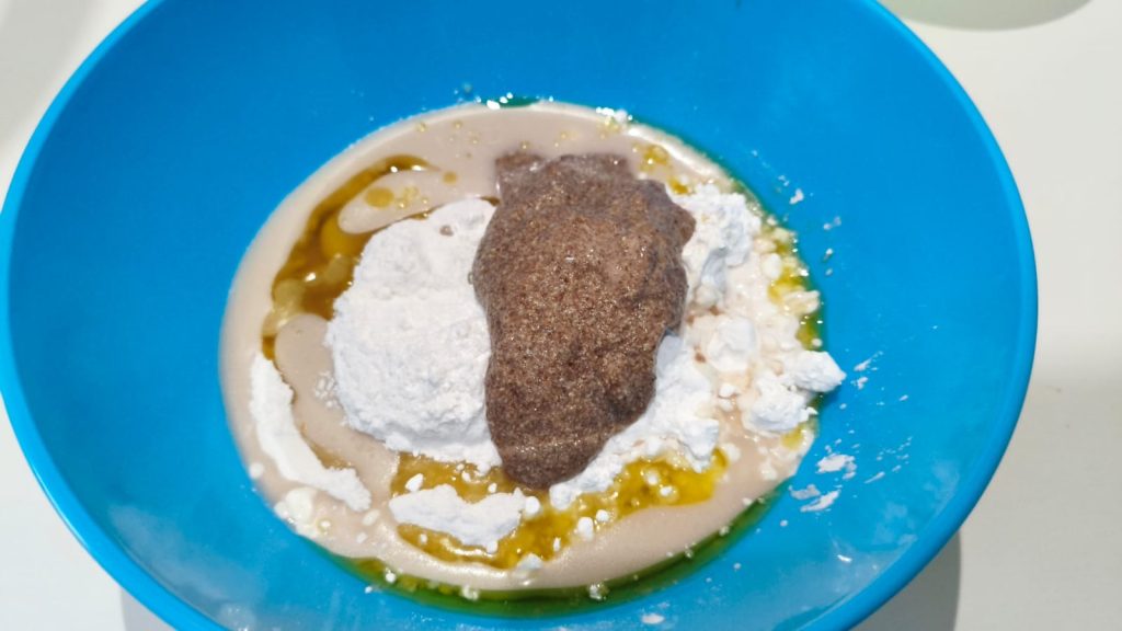 In einer großen Schüssel Reismehl, Stärke und Salz vermengen, dann das Leinsamengel, die aktivierte Hefe und das Öl dazugeben.
