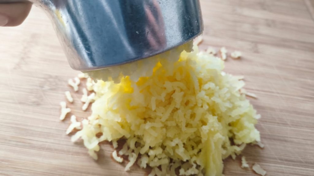 Die zerdrückten Kartoffeln auf der Arbeitsfläche ausbreiten und etwas abkühlen lassen.