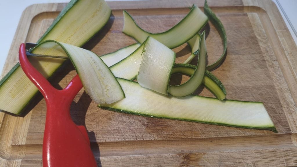 • Um die Hähnchenbrust-Rouladen mit Zucchini und Schinken zuzubereiten, beginnen Sie mit den Zucchini: waschen Sie sie und schneiden Sie sie mit einem Hobel oder Messer fein. Legen Sie die dünne Hähnchenbrustscheibe aus und legen Sie ein oder zwei Zucchinischeiben, den Schinken und den Galbanino oder einen schmelzenden Käse darauf.