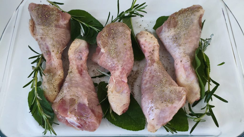 Hacke fein Salbei, Rosmarin, Salz und weißen Pfeffer. Reibe die Hähnchenschenkel gut mit dieser Kräutermischung ein und lege sie in eine Auflaufform.