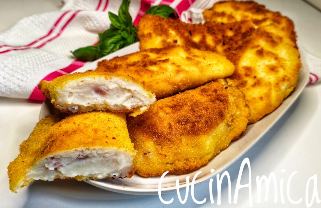 • Mit Béchamel und Schinkenwürfeln füllen und den Teig über sich selbst klappen, um einen Halbmond zu formen.