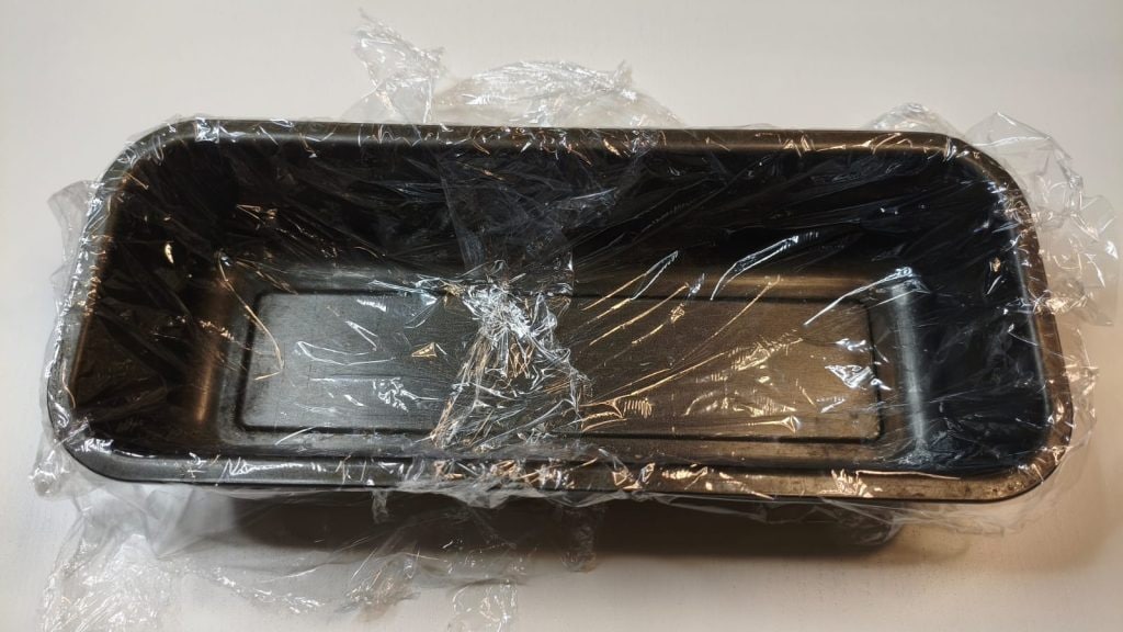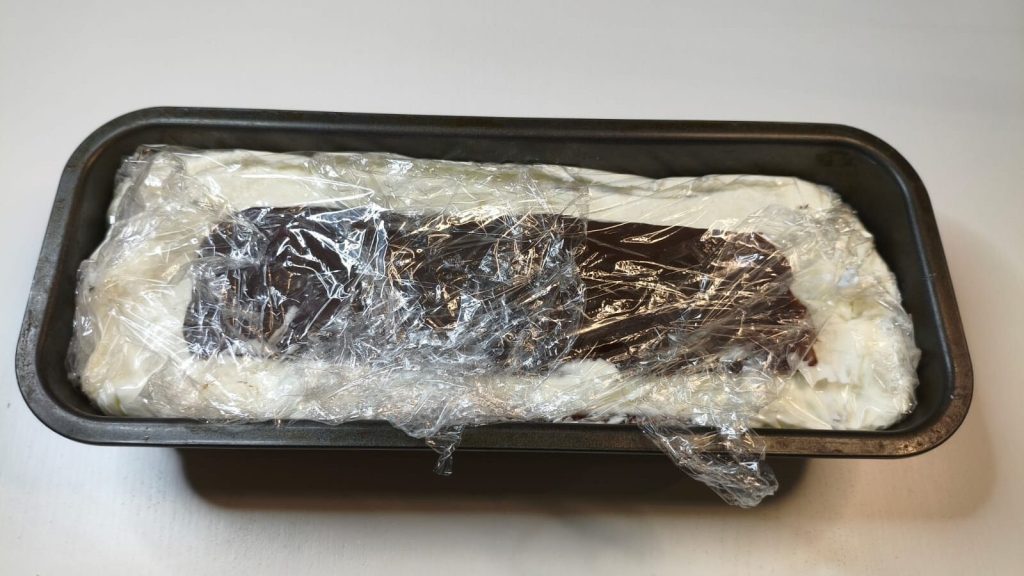 • Eine Kastenform mit Frischhaltefolie auslegen und Schichten von Creme und Schokoladenstreifen erstellen.