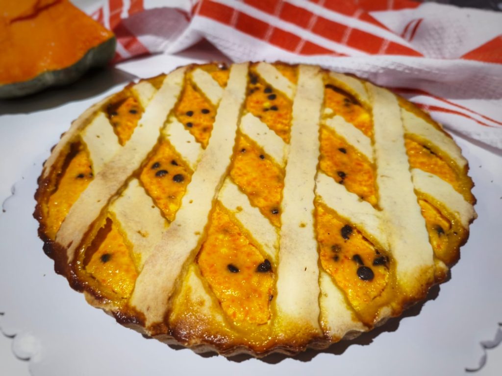 • Die Ricotta-Kürbis-Füllung einfüllen und glatt streichen. Mit Mürbeteigstreifen dekorieren und im vorgeheizten Backofen bei 180 °C etwa 45 Minuten backen, bis die Oberfläche goldbraun ist.