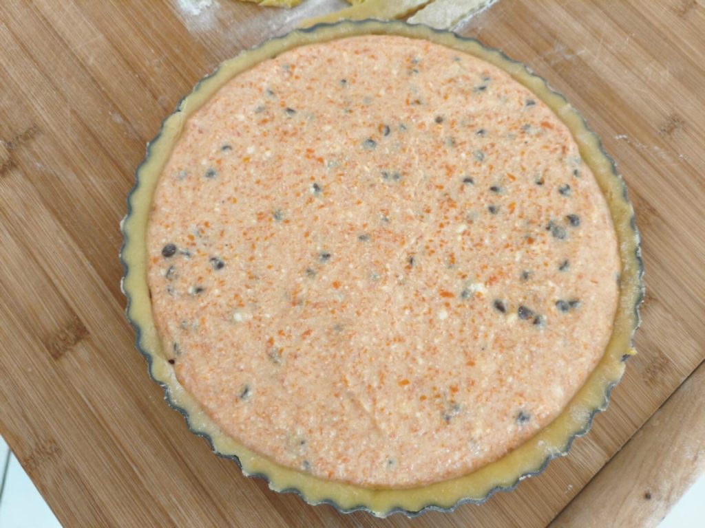• Montiere die Torte: Den Mürbeteig ausrollen und eine Tarteform damit auskleiden, aus dem restlichen Teig Streifen vorbereiten.
