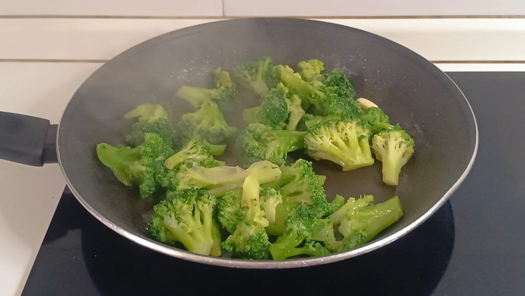 Die gekochten Brokkoli hinzufügen und einige Minuten ziehen lassen.