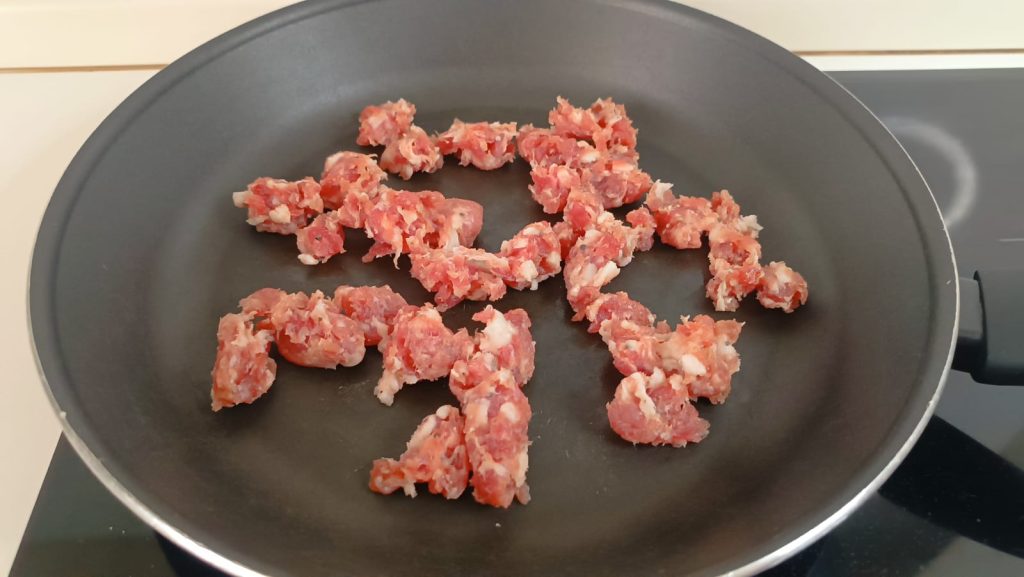 In der Zwischenzeit die Wurst zerbröseln und in der Pfanne anbraten