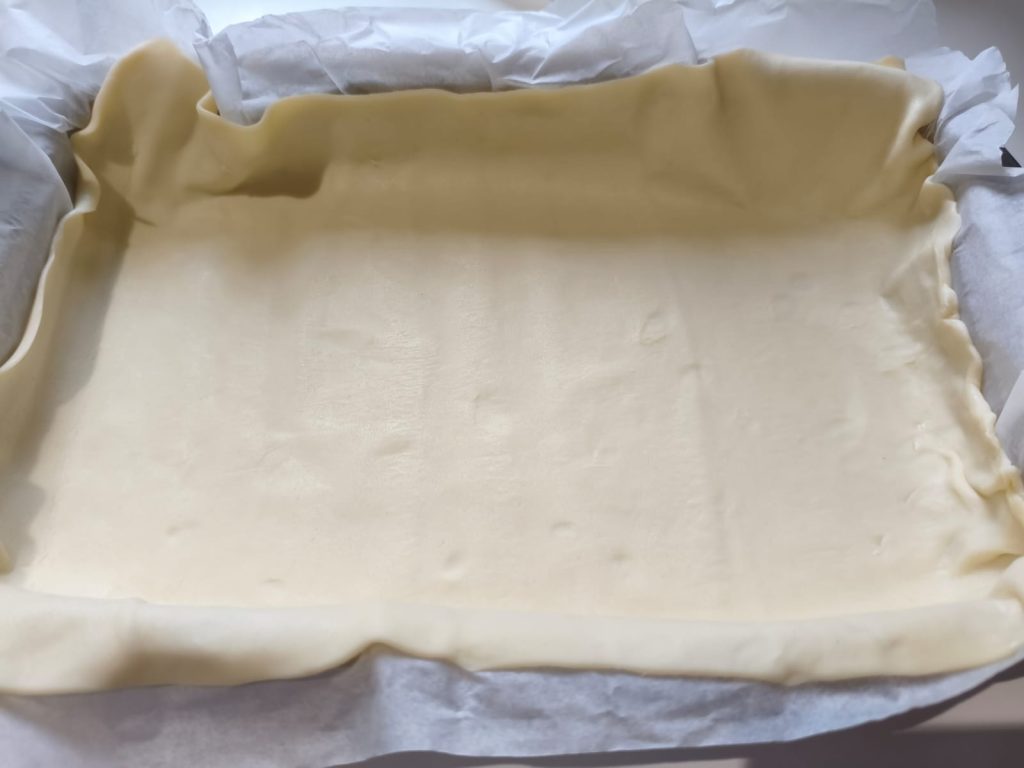 Legen Sie eine Auflaufform mit dem Blätterteig aus, gießen Sie die Mischung hinein und backen Sie sie im vorgeheizten Ofen bei 180°C für etwa 30-35 Minuten, bis die Oberfläche goldbraun ist.