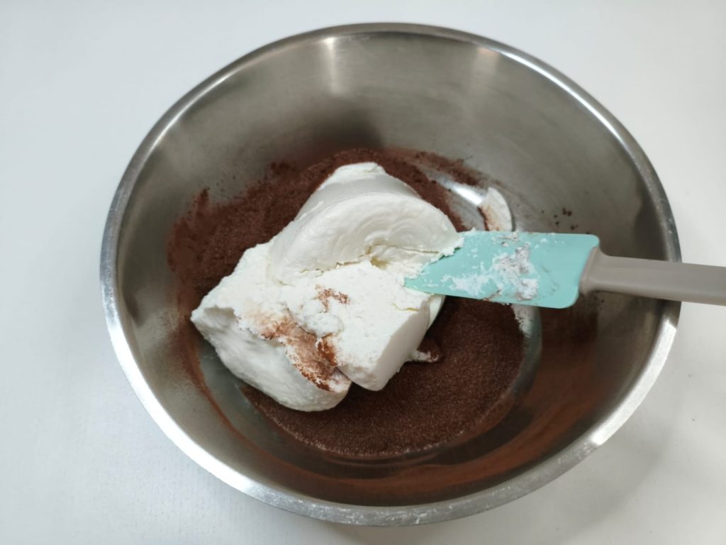 Bereite die Ricottacreme zu: Zucker und Kakao vermengen.