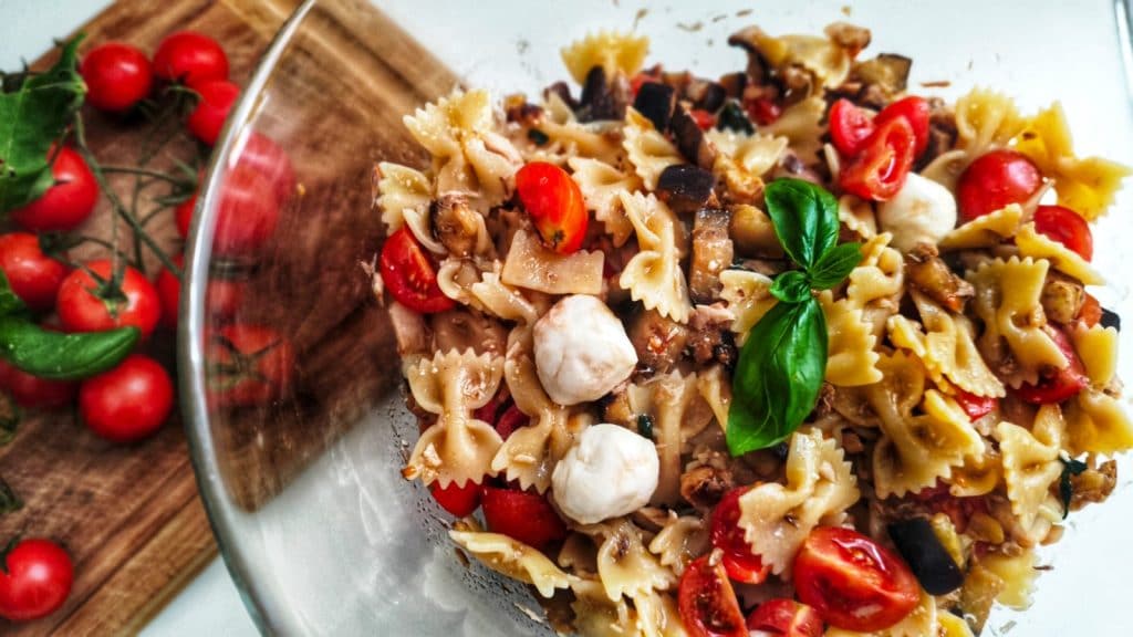 Der kalte Sommernudelsalat mit Auberginen und Kirschtomaten ist eine geniale Idee für ein schnelles Mittagessen, um es mit ans Meer zu nehmen oder auch für ein Abendessen im Freien mit Freunden. Es ist ein Gericht, das alle zufriedenstellt und perfekt ist, um frisches Gemüse aus dem Garten oder vom Markt zu verwenden.