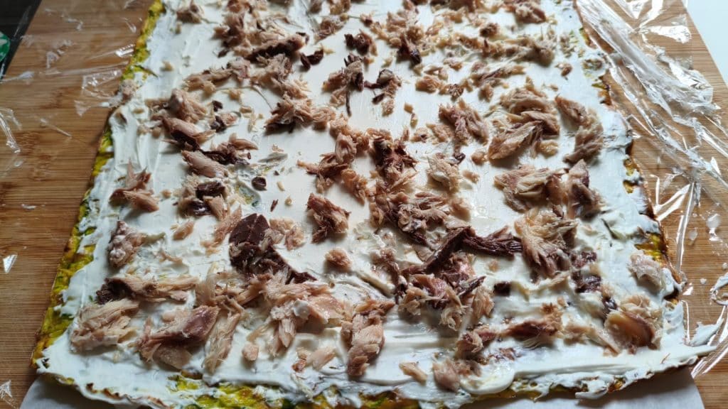 • Sobald es kalt ist, das Omelett abrollen und nach Belieben füllen. Ich habe Philadelphia auf der gesamten Oberfläche des Wickels verteilt und mit Makrele belegt.