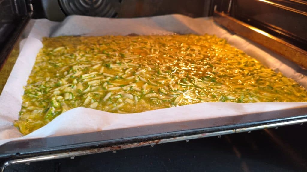 • Nachdem alles gut vermischt ist, die Masse in eine mit Backpapier ausgelegte Form geben und glattstreichen.