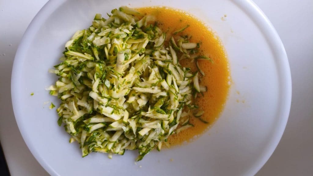 Die Eier mit Salz und Käse schlagen und die geriebenen Zucchini hinzugeben.
