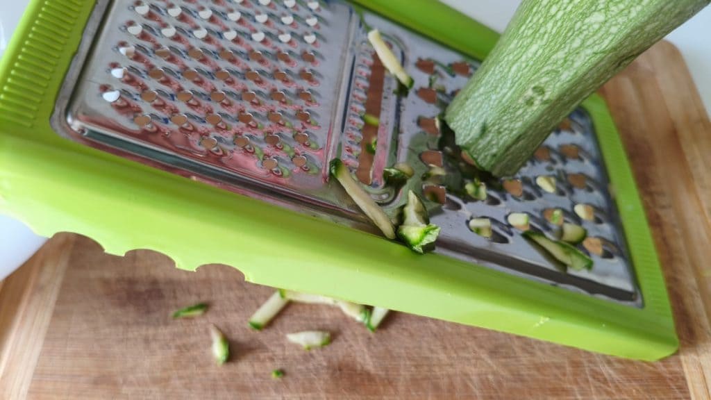 • Um den kalten Zucchini-Omelett-Wickel vorzubereiten, die Zucchini mit der Reibe auf der Seite mit den größeren Löchern in Julienne-Streifchen schneiden.
