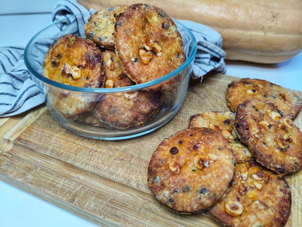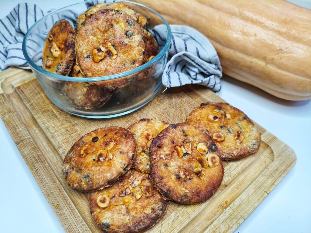 Ich habe den Kürbis im Ofen gebacken, wie man es macht, um ein süßes und trockenes Fruchtfleisch zu erhalten, dann habe ich ihn püriert, bis ich eine samtige Creme erhielt. In einer Schüssel habe ich Mehl, Eier, Zucker, den mittlerweile kalten Kürbis und einen Teelöffel Backpulver vereint. Um sie noch köstlicher zu machen, habe ich Schokoladenstückchen hinzugefügt und, nachdem ich die Kekse ausgestochen hatte, habe ich sie mit einer Prise gehackter Haselnüsse dekoriert. Das Ergebnis? Einfache und köstliche Kürbiskekse, perfekt für das Frühstück oder den Snack.