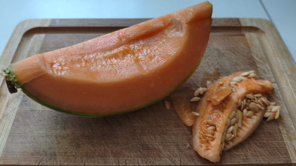 • Um den Melonensalat zuzubereiten, beginnen Sie damit, die Melone von Kernen und ihren Fasern zu reinigen. Entfernen Sie die Schale und schneiden Sie sie schließlich in Würfel.