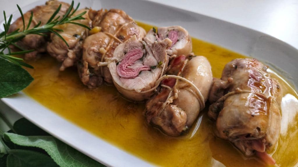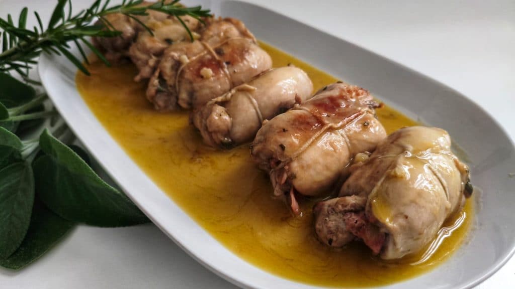 Jede Roulade wird sorgfältig gerollt und verschlossen, um die Zartheit zu bewahren, dann langsam mit einem Hauch von Weißwein gekocht, der die Aromen hebt und dem Gericht eine elegante Note verleiht.