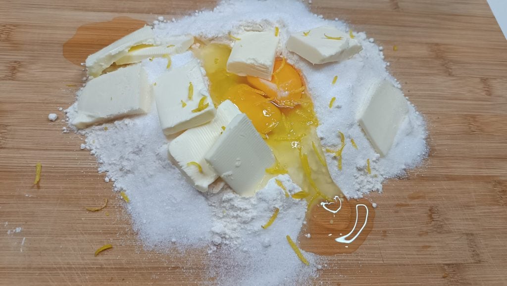 • Das Mehl in einen Berg aufhäufen, Zucker, Eier, Butter und die geriebene Zitronenschale hinzufügen.