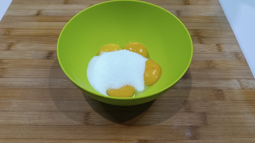 • In der Zwischenzeit die Creme vorbereiten, indem man Zucker zu den Eigelben hinzufügt