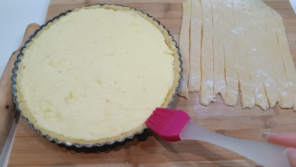 • Den Teig mit etwas Wasser benetzen, damit die Streifen gut haften