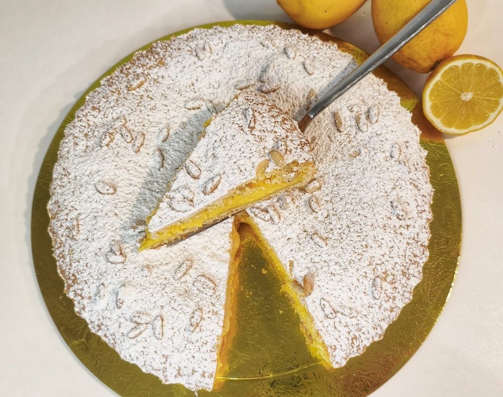 Die Basis ist ein buttriger und zarter Mürbeteig, der eine zitronenaromatisierte Puddingcreme umhüllt. Die gerösteten Pinienkerne auf der Oberfläche fügen diesen Kontrast der Texturen hinzu, der jeden Bissen zu einem wahren Genuss macht. Und das Beste daran ist, dass man ihn sowohl frisch zubereitet genießen kann, wenn der Mürbeteig knusprig ist, als auch nach einigen Stunden, wenn alle Aromen perfekt verschmelzen.