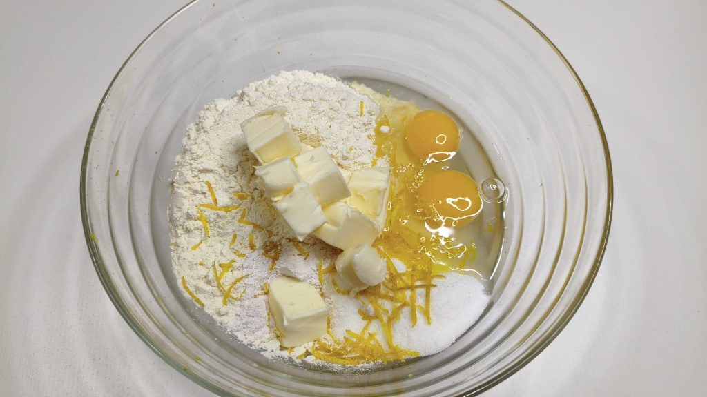 In einer Schüssel alle Zutaten hinzufügen: das Mehl, die Eier, die Zitronenschale, die Butter, den Zucker und das Backpulver. Schnell kneten und die Mischung in eine Plastikfolie einwickeln. 40 Minuten im Kühlschrank aufbewahren.