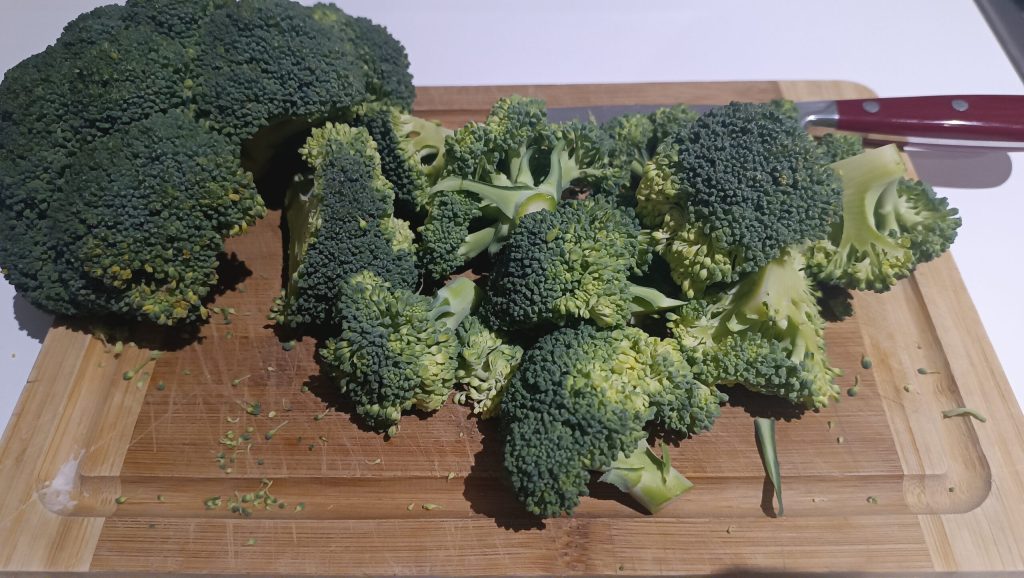 Die Blätter und den Stiel entfernen und den Brokkoli in Röschen schneiden.