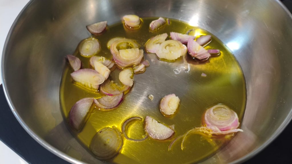 Nachdem die Zwiebel in dünne Scheiben geschnitten wurde, in einem Topf mit etwas Öl anbraten.
