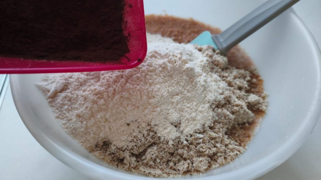 Siebe Mehl, Mandelmehl, Kakao und Backpulver. Hebe sie mit einem Spatel vorsichtig unter den Teig.