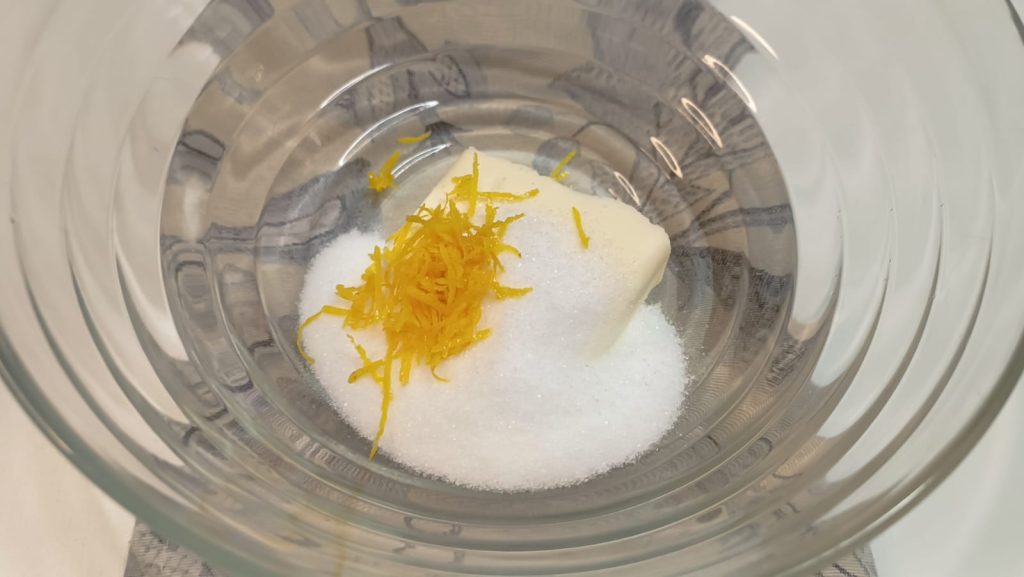 • Beginnen Sie mit der Herstellung des Mürbeteigs: Butter, Zitronenschale und Zucker zusammenfügen