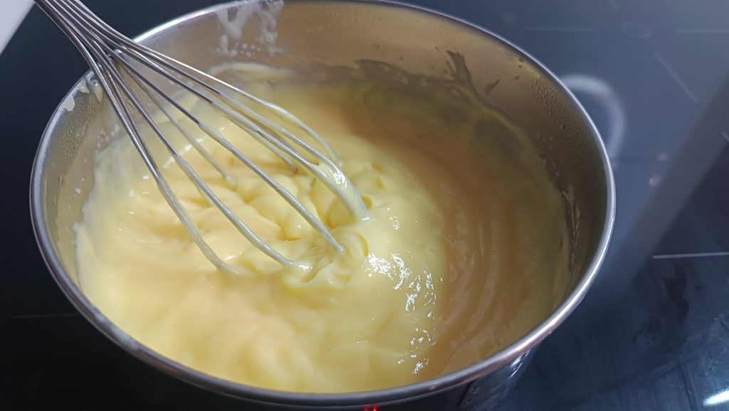 • In der Zwischenzeit die Creme zubereiten, indem die Eigelbe mit dem Zucker vermischt werden. Mit einem Schneebesen schlagen, bis eine helle Creme entsteht