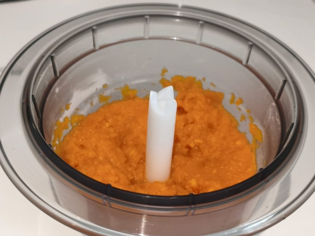Entferne den Knoblauch und püriere den Kürbis, bis eine glatte Creme entsteht. Lass sie abkühlen.