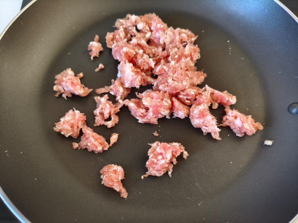 In einer Kasserolle die gehackte Zwiebel mit einem Schuss Öl anbraten. Die Hälfte der zerbröckelten Wurst hinzugeben und braten, bis sie goldbraun ist.