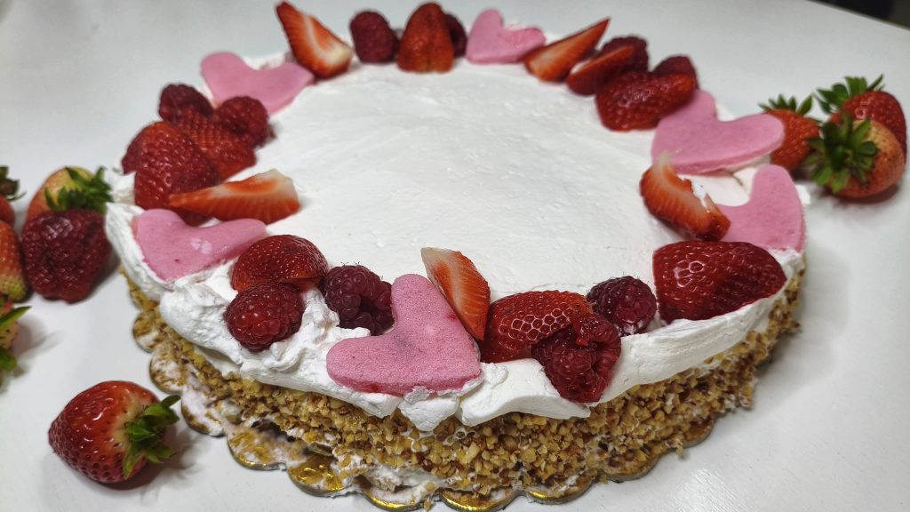 • In die mit Sahne bedeckten Ränder Haselnusskrokant hinzufügen. Nach Belieben dekorieren