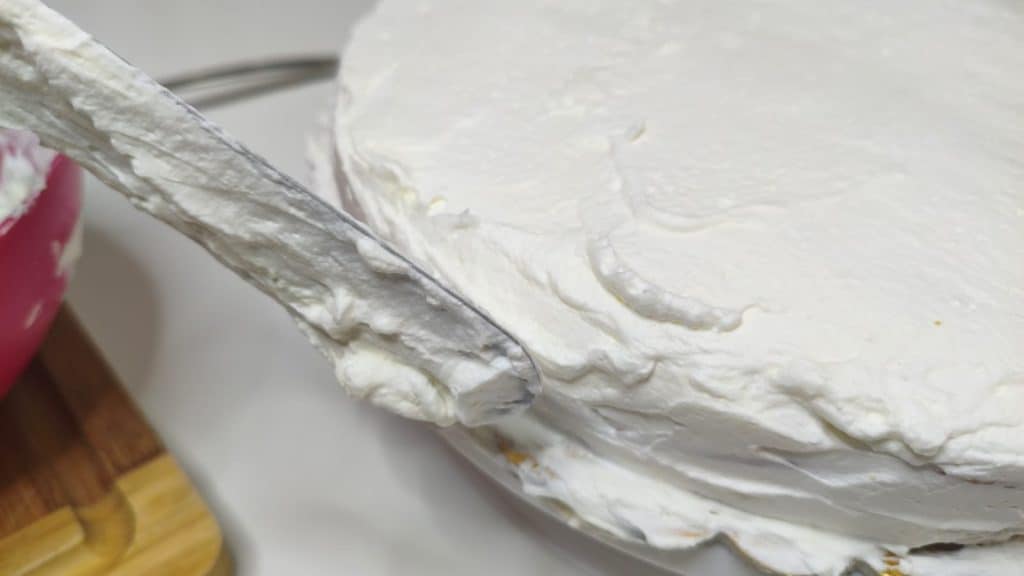 • Die letzte Schicht mit der restlichen Schlagsahne bestreichen und auch die Seiten bedecken.