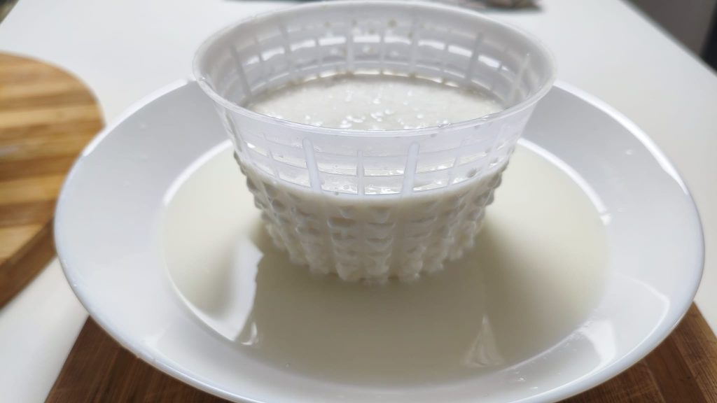 Nach dieser Zeit siehst du die Bruchmasse in der Molke – mit einem feinmaschigen Sieb auffangen.