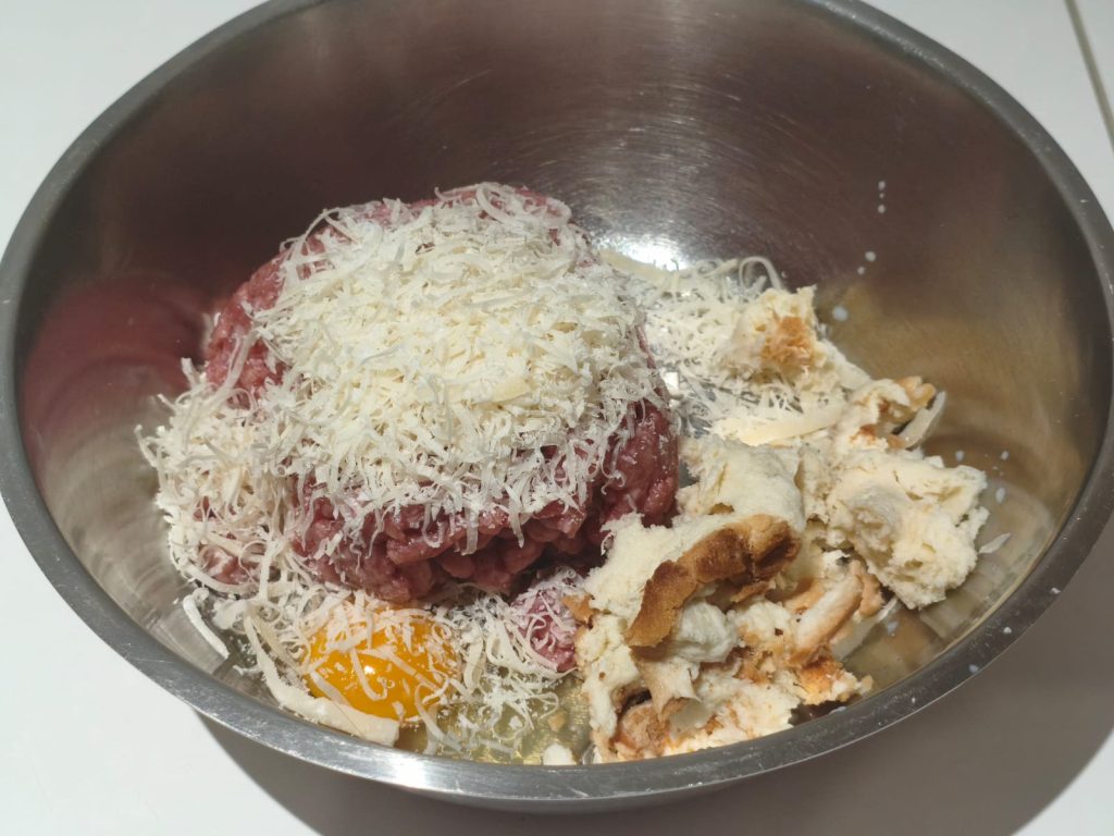 In einer Schüssel Fleisch, Ei, Parmesan, Knoblauch, Petersilie, Salz und Pfeffer sowie das in Milch eingeweichte Toastbrot vermengen.